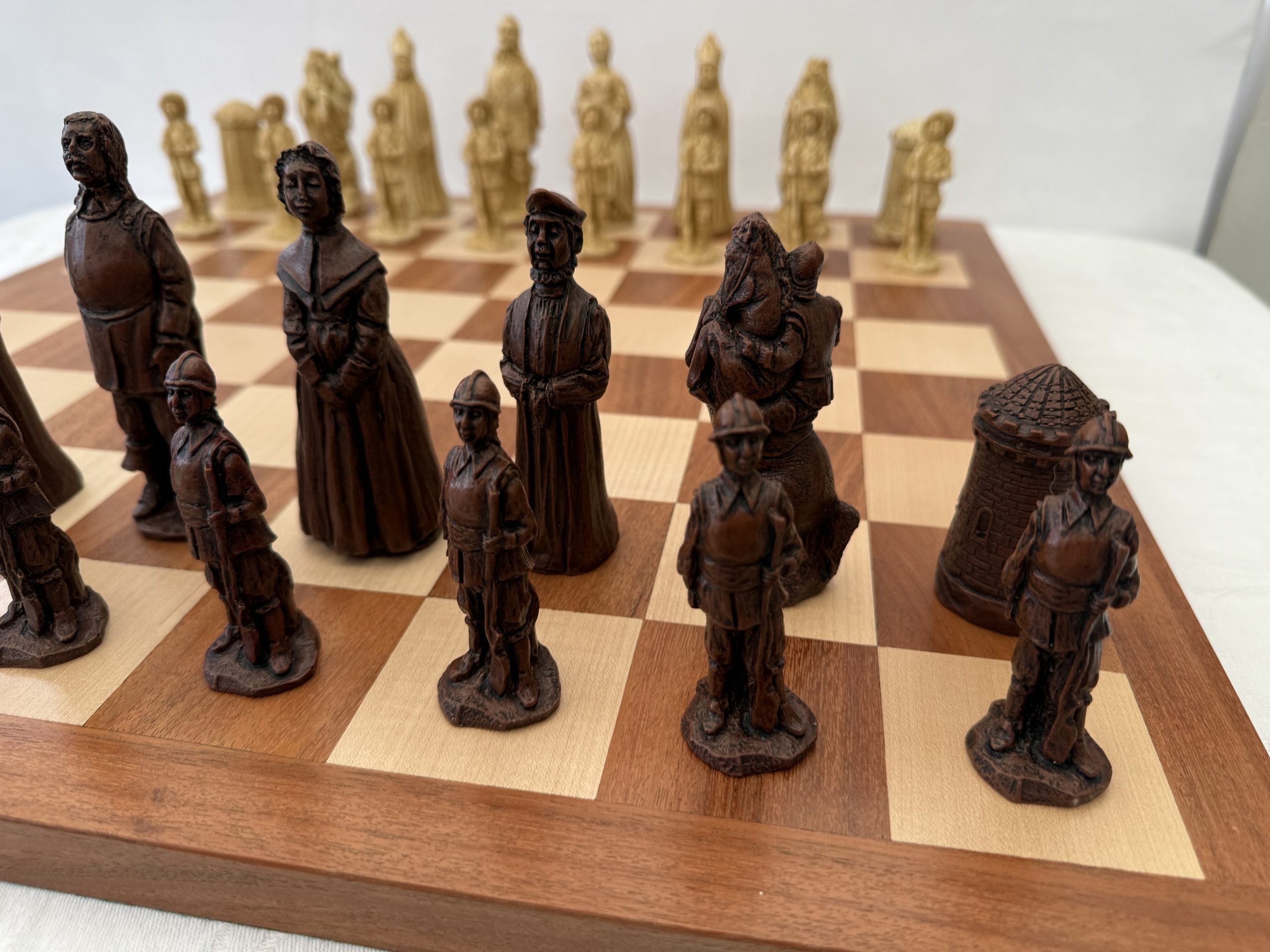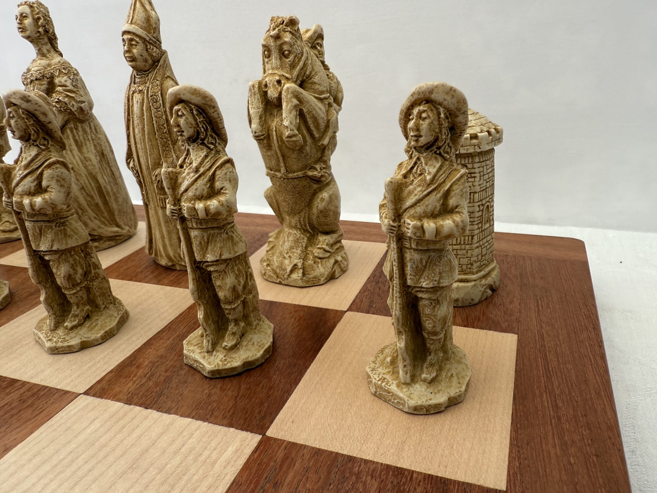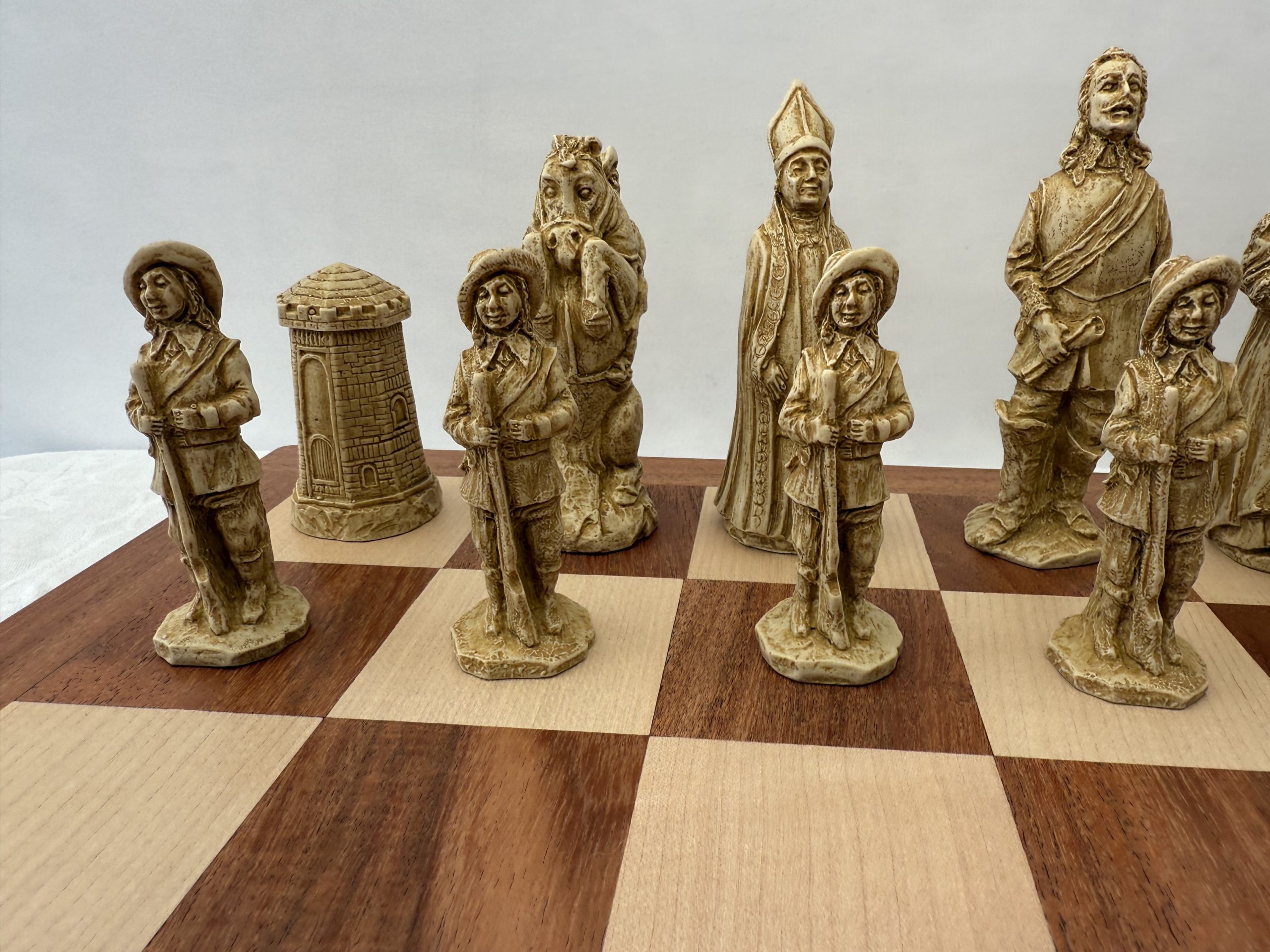 This Berkeley Chess Cavaliers vs Roundheads Chess Set brings the drama of the English Civil War of 1642-1651 to the board. Made in solid stone blended with resin, each piece has reassuring weight and detail. The white side represents the Cavaliers, loyal to the monarchy and known for elegant dress and plumed hats; the light brown side portrays the Roundheads, the disciplined Parliamentarian forces recognised for their simpler armour and plain attire. The King stands 4 inches tall, giving the set presence without overwhelming your board.