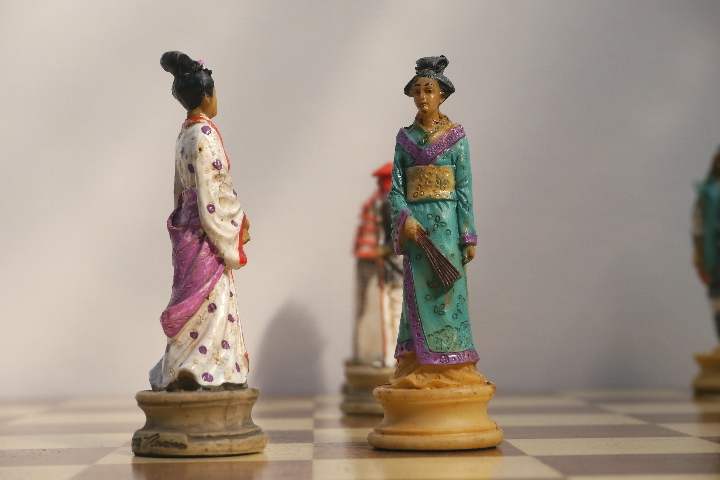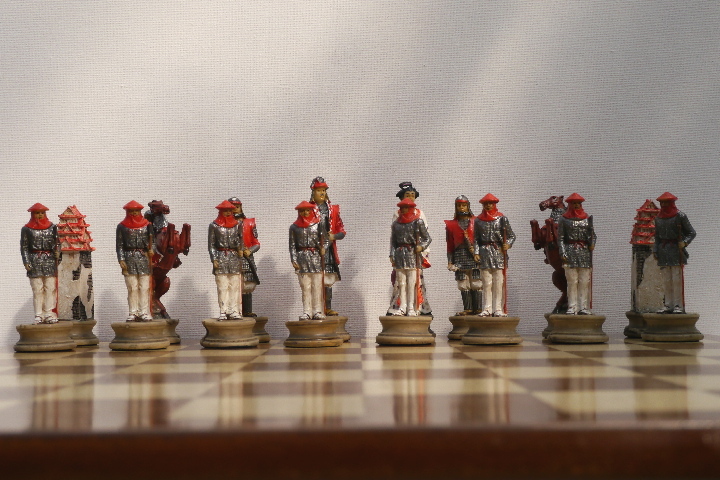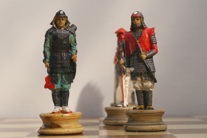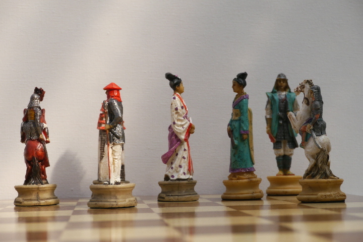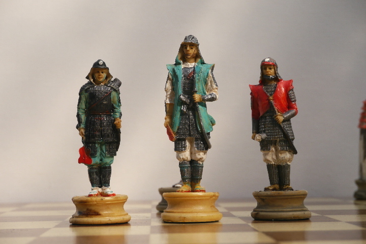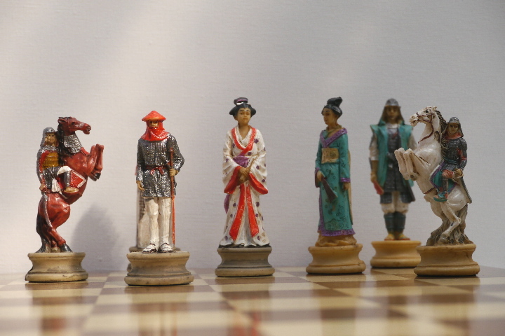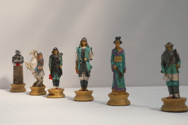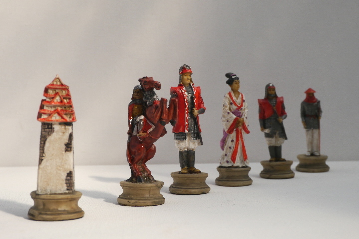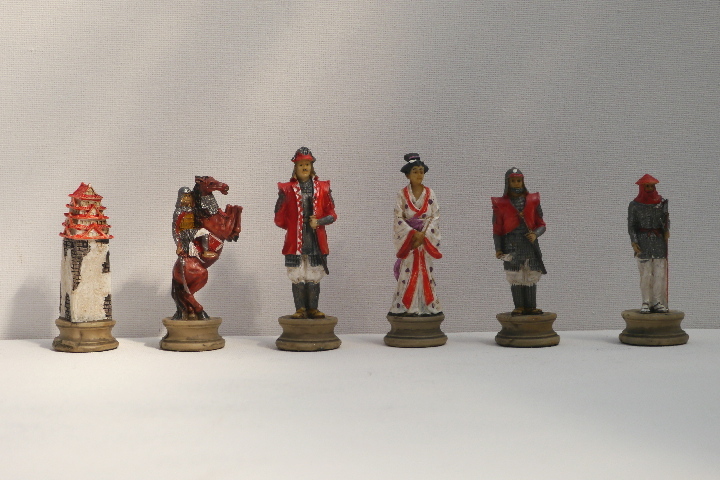 This product from Chess Baron: Japanese Samurai: A chess set that includes a presentation case. Heavily weighted by crushed stone and bonded by high quality resin. Excruciatingly hand painted and decorated.